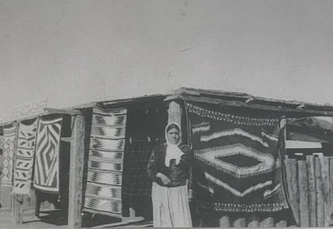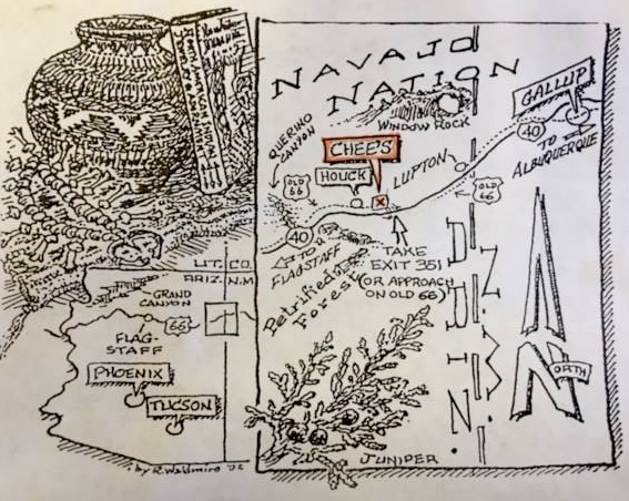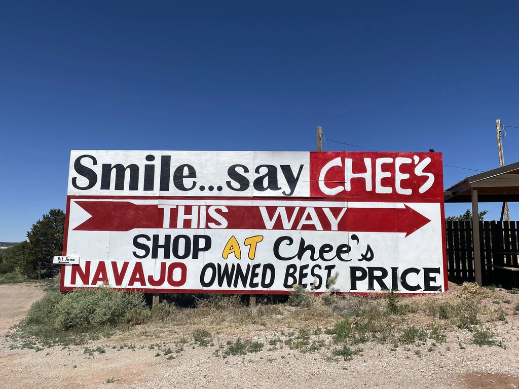The Chee family (Chee meaning “red” in Navajo) established Chee’s Indian Store on old Route 66 in 1948. Eva Chee, built a outdoor covered stand to display Navajo woven rugs and jewelry. Chee family maternal clan is Honágháanii.