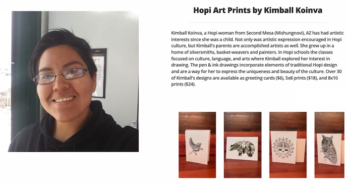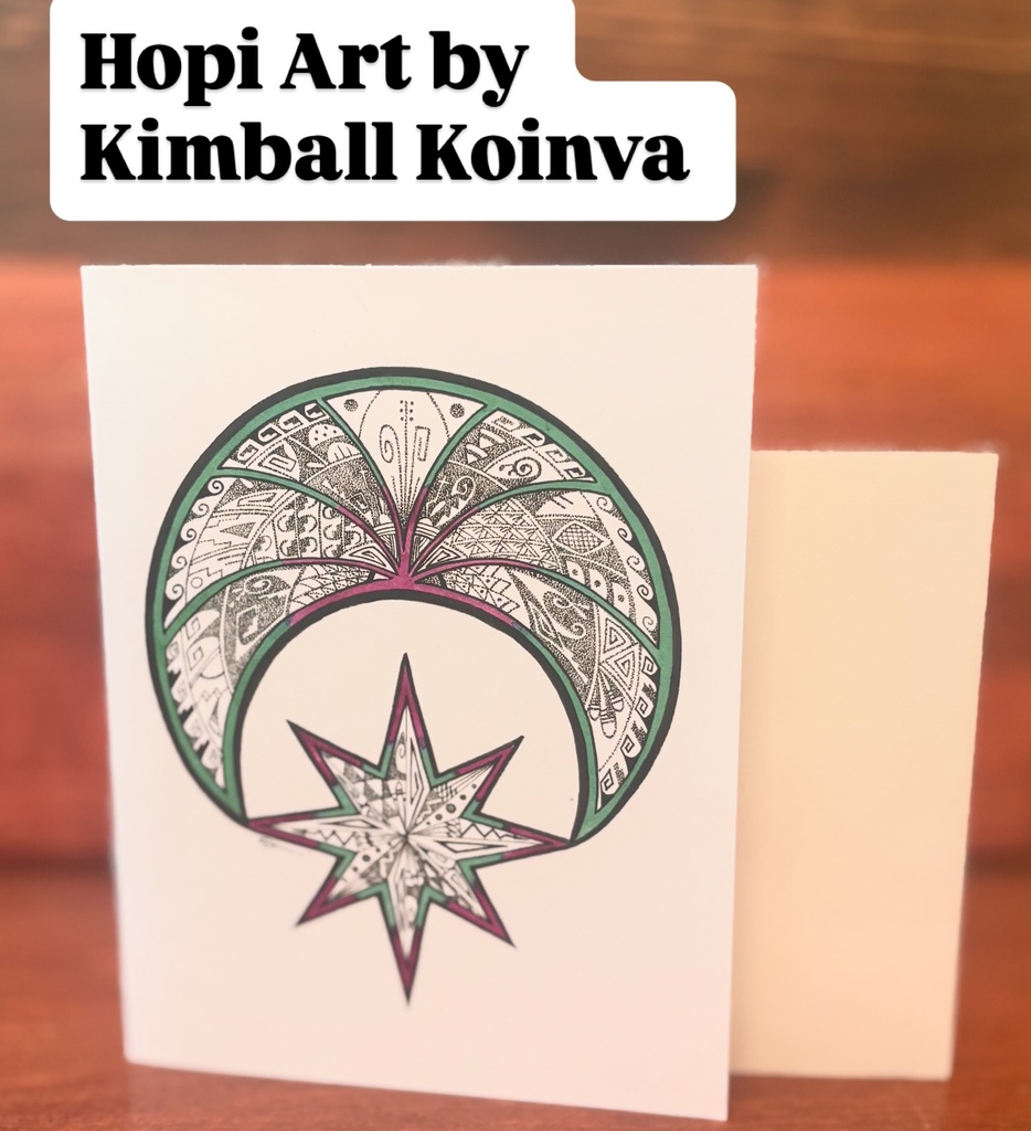 Kimball Koinva, a Hopi woman from Second Mesa (Mishongnovi), AZ has had artistic interests since she was a child. Not only was artistic expression encouraged in Hopi culture, but Kimball's parents are accomplished artists as well. She grew up in a home of silversmiths, basket-weavers and painters. In Hopi schools the classes focused on culture, language, and arts where Kimball explored her interest in drawing. The pen & ink drawings incorporate elements of traditional Hopi design and are a way for her to express the uniqueness and beauty of the culture. Over 30 of Kimball's designs are available as greeting cards (shop here).