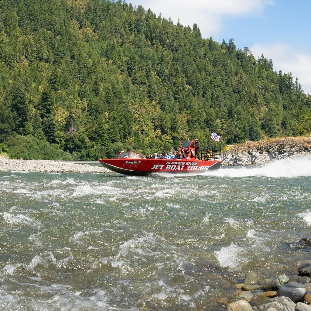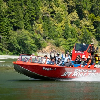 The Klamath River Jet Boats travels 22 miles up the beautiful scenic Klamath River. Our experienced captain and narrator will describe the River’s rich history, local Native American culture, and thriving wildlife. Bear, Black tail Deer, Elk, Soaring Osprey, Eagles, Hawks, Otters, Mink and many other varieties of wildlife may be seen by looking carefully along the riverbanks.