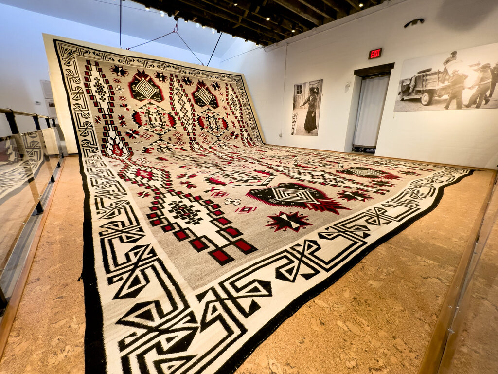 In 1932, master weaver Julia Bah Joe and daughter Lillie Joe Hill of Lower Greasewood, Arizona, embarked on a remarkable journey to create “The World’s Largest Navajo Rug” for Lorenzo Hubbell Jr.’s trading post in Winslow, Arizona. During the Great Depression, Hubbell sought to attract customers to his business and recognized the potential draw of a monumental rug. He commissioned the Joe family, who had long provided large rugs to Hubbell Trading Posts, to transform this idea into a reality. With the support of Julia’s husband Sam and daughters Emma, Mary, and Helen, alongside the Kin ł ichii’nii (Red House) Clan, Julia and Lillie spent the next five years focused on achieving that goal.