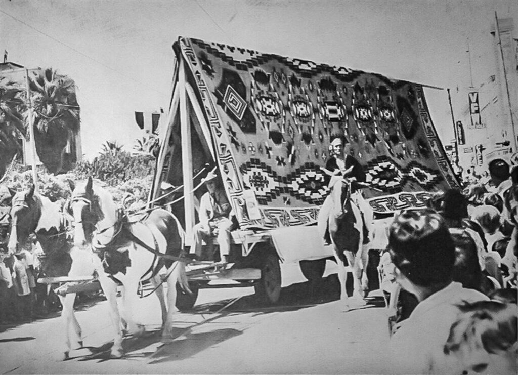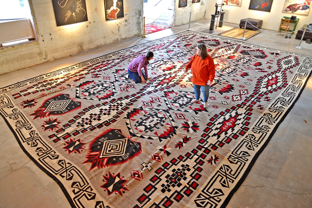 Diyogí Tsoh is the largest known traditionally made Navajo (Diné) Rug. The rug does not use commercially produced wool, but rather hand-carded, dyed, and spun wool from family sheep. It is on exhibit at Affeldt Mion Museum, thanks to a long-term loan from the Winslow Arts Trust. The Big Rug was returned to Winslow in 2012 thanks to Allan Affeldt and Tina Mion after many years in storage. You can come visit the Big Rug located at La Posada Hotel.