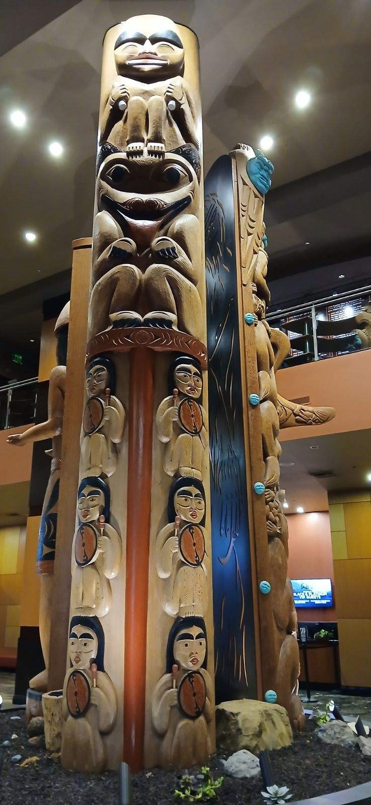 James Madison, a Tulalip master carver and sculptor of Snohomish, Tlingit, and Coast Salish heritage, created a striking 24-foot story pole that anchors the hotel lobby. Outside the resort’s entrance, Salish artist Joe Gobin crafted a welcoming totem. The resort also highlights the work of artists from neighboring tribes: Phil Gray, a Tsimshian and Mikisew Cree artist, is celebrated for his intricate wood carvings; Colville artist Joe Feddersen contributes bold mixed-media pieces; and Tlingit artist Preston Singletary reimagines traditional stories through the modern medium of glass, and more.